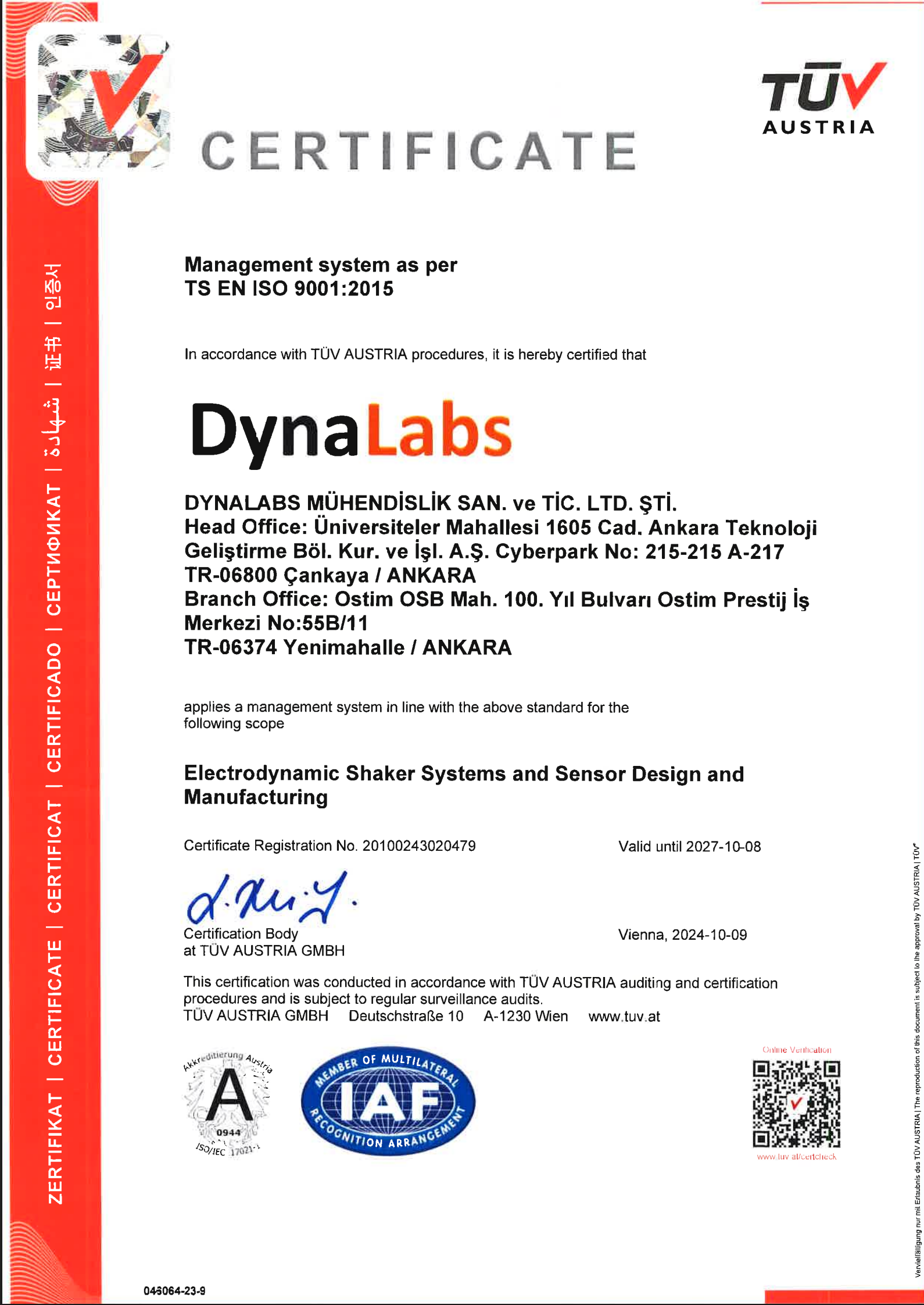 As DynaLabs, we have implemented the ISO 9001:2015 Quality Management System to provide our customers with planned and high-quality services. As of October 9, 2024, we have successfully completed the audit process conducted by TÜV AUSTRIA within the scope of Electrodynamic Shaker Systems and Sensor Design and Manufacturing.